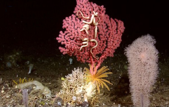 在这张由“俄刻阿洛斯探险者”号探险小组公布的照片中,一条肉乎乎的海蛇尾摆动着身躯在粉红色的珊瑚中穿梭。据美国国家海洋与大气管理局专家介绍,粉红色珊瑚由一组复杂、微小的骨骼结构构成,被一种有机“黏合剂”粘到了一起。