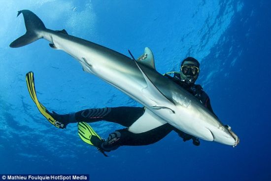 了让鲨鱼平静下来,照片中的的Jorge温柔地抓住鲨鱼的身体并让它呈垂直的状态。这一令人难以置信的的瞬间被来自法国的海洋生物学家Mathieu Foulquie见证。俩人在古巴的女王国家海洋公园里潜水时发生了如此奇特的事。