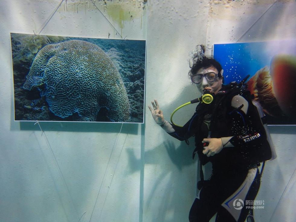 此次室内水池环境摄影作品展开创摄影展览新方式,强调参与性、互动性和体验性。海洋生物仿佛在真实的海底隐匿生活着,而参观者身着潜水服置身在5米深的水底,一种改变以往感官经验的方式被呈现出来,照片与水奇妙地融为一体,给参观者非同一般的视觉体验。