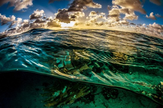 海面上阳光将云朵渲染成金色,海面之下各种样式的珊瑚礁美丽异常。