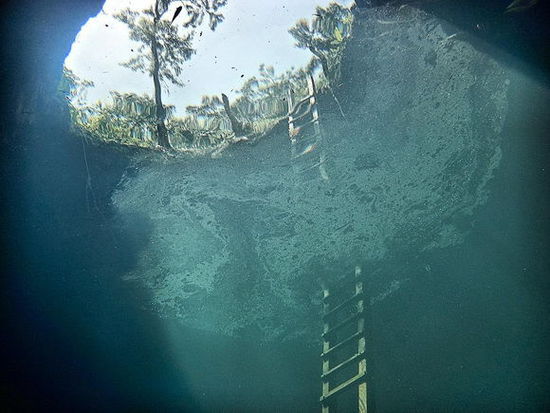 此处的水异常清澈,潜水者甚至看起来像是漂浮在空中而非水中。这片水域有着古老历史,蕴藏着许多化石,但是水下通道繁多,像迷宫一样,因而增加了其危险程度。